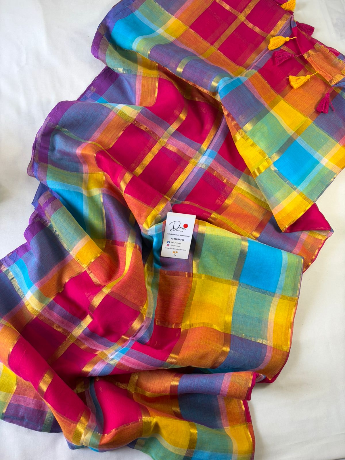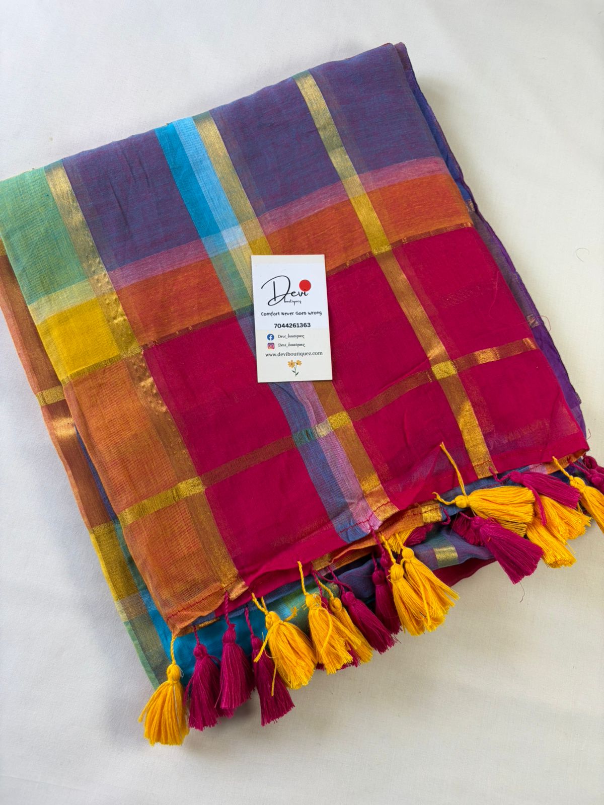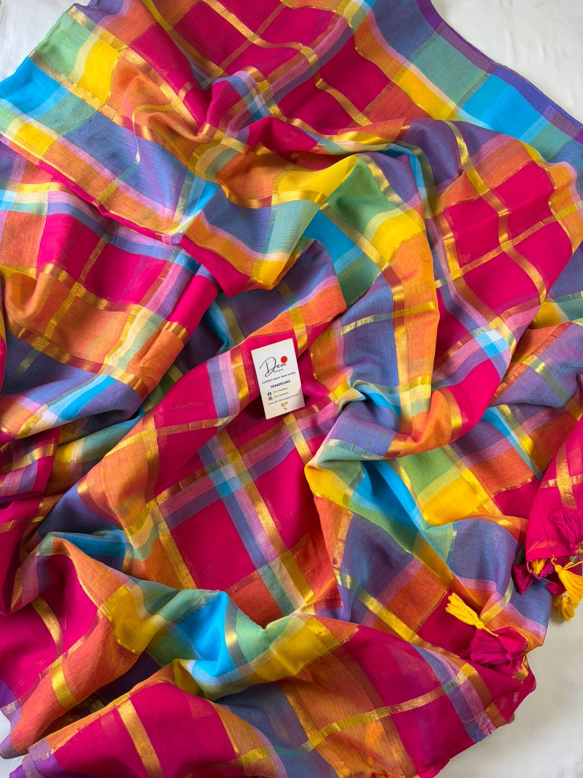 Fabric: MULCOTTON Blouse Piece: NO Wash Care 1.Dry clean only 2. Medium iron Disclaimer: The pictures are clicked in daylight. Color may vary slightly from the image due to the screen brightness